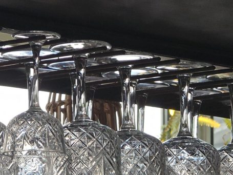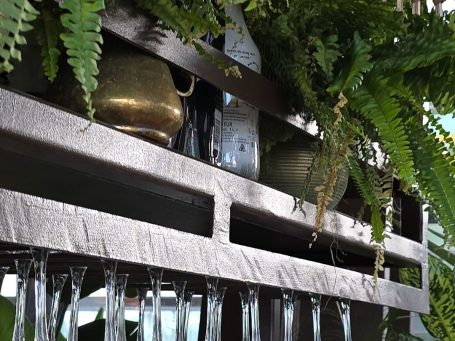 Zoom in op het slimme glazenrek, naadloos geïntegreerd in het totaalontwerp.